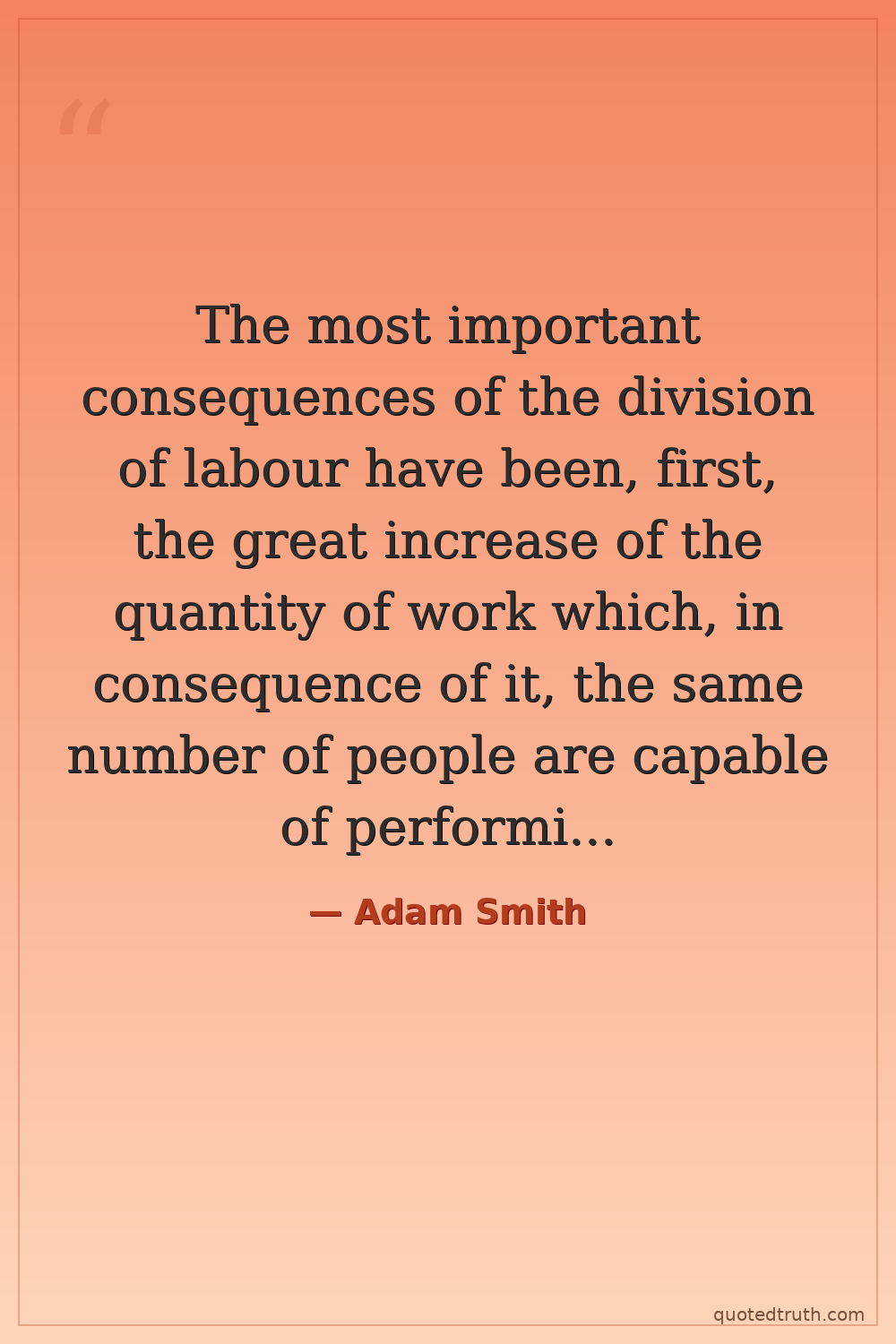 The most important consequences of the division of labour have been, first, the great increase of the quantity of work which, in consequence of it, the same number of people are capable of performing; and, secondly, the improvement of the skill and dexterity of the workman.