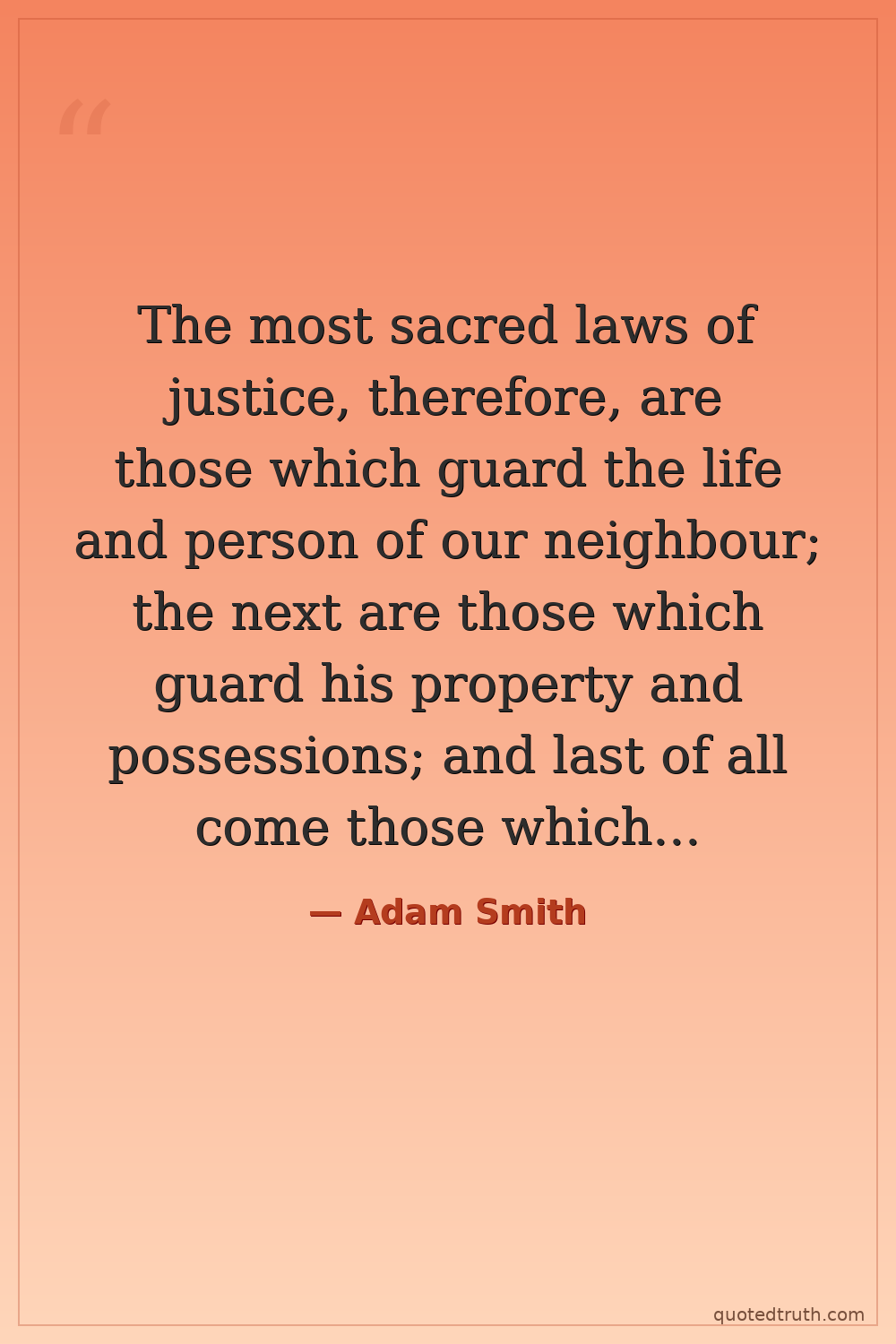 The most sacred laws of justice, therefore, are those which guard the life and person of our neighbour; the next are those which guard his property and possessions; and last of all come those which guard what are called his personal rights, or what is due to him from the promises of others.