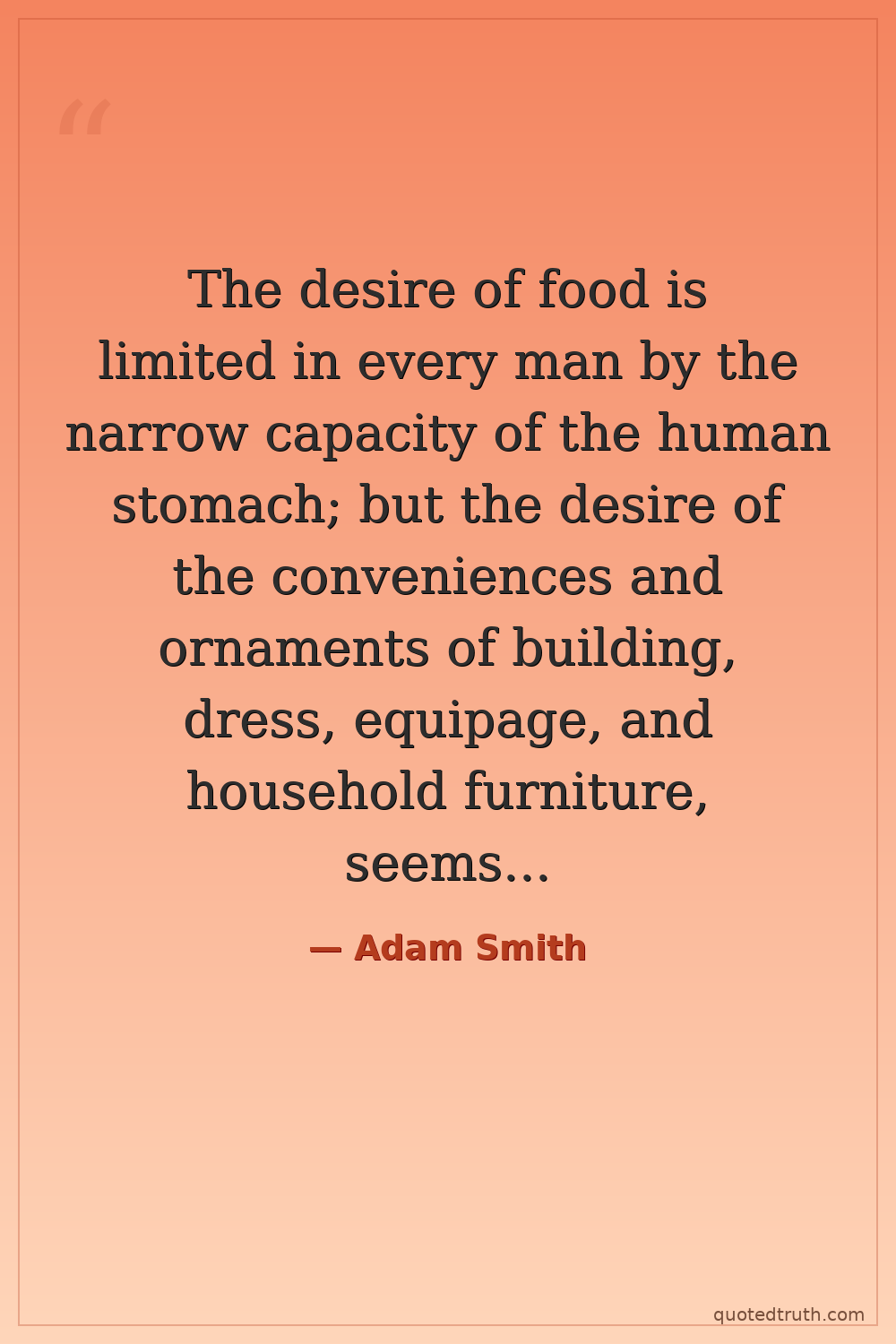 The desire of food is limited in every man by the narrow capacity of the human stomach; but the desire of the conveniences and ornaments of building, dress, equipage, and household furniture, seems to have no limit or certain boundary.