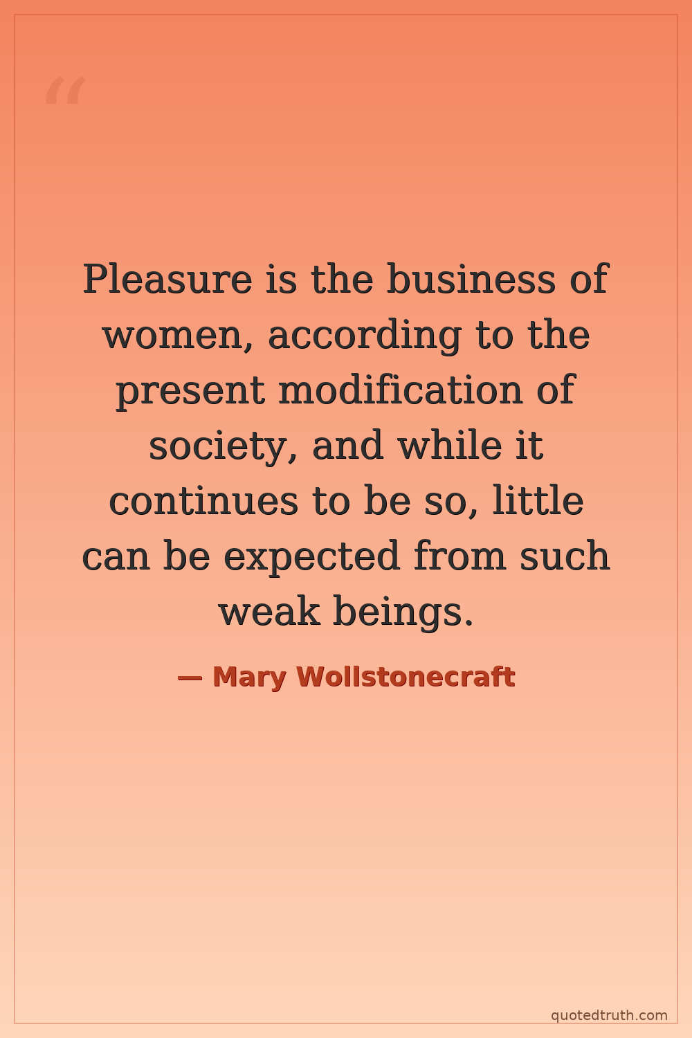 Pleasure is the business of women, according to the present modification of society, and while it continues to be so, little can be expected from such weak beings.