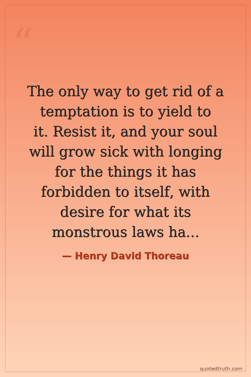 The only way to get rid of a temptation is to yield to it. Resist it, and your soul will grow sick with longing for the things it has forbidden to itself, with desire for what its monstrous laws have made monstrous and unlawful. — Henry David Thoreau Modern Civil disobedience, Walden