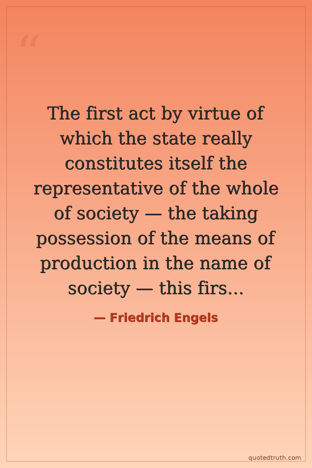 The first act by virtue of which the state really constitutes itself the representative of the whole of society — the taking possession of the means of production in the name of society — this first act is also its last as a state. — Friedrich Engels Modern Communist Manifesto co-author