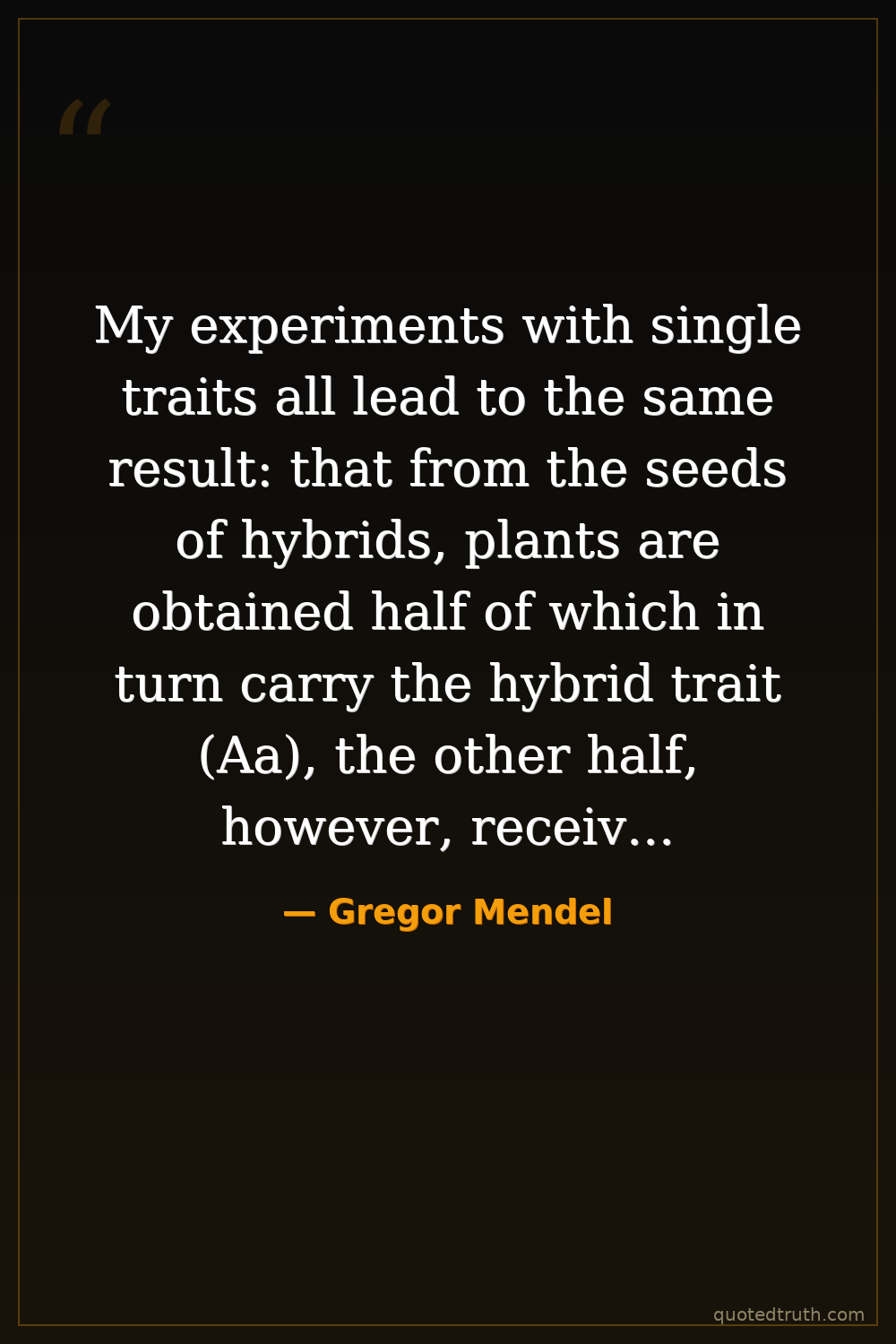 My experiments with single traits all lead to the same result: that from the seeds of hybrids, plants are obtained half of which in turn carry the hybrid trait (Aa), the other half, however, receive the parental traits A and a in equal amounts. — Gregor Mendel Modern Father of genetics