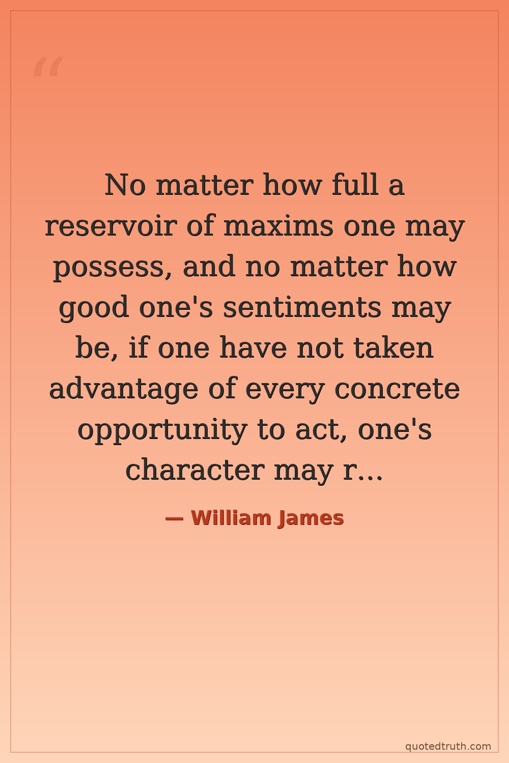 No matter how full a reservoir of maxims one may possess, and no matter how good one's sentiments may be, if one have not taken advantage of every concrete opportunity to act, one's character may remain entirely unaffected for the better. — William James Modern Pragmatism, psychology