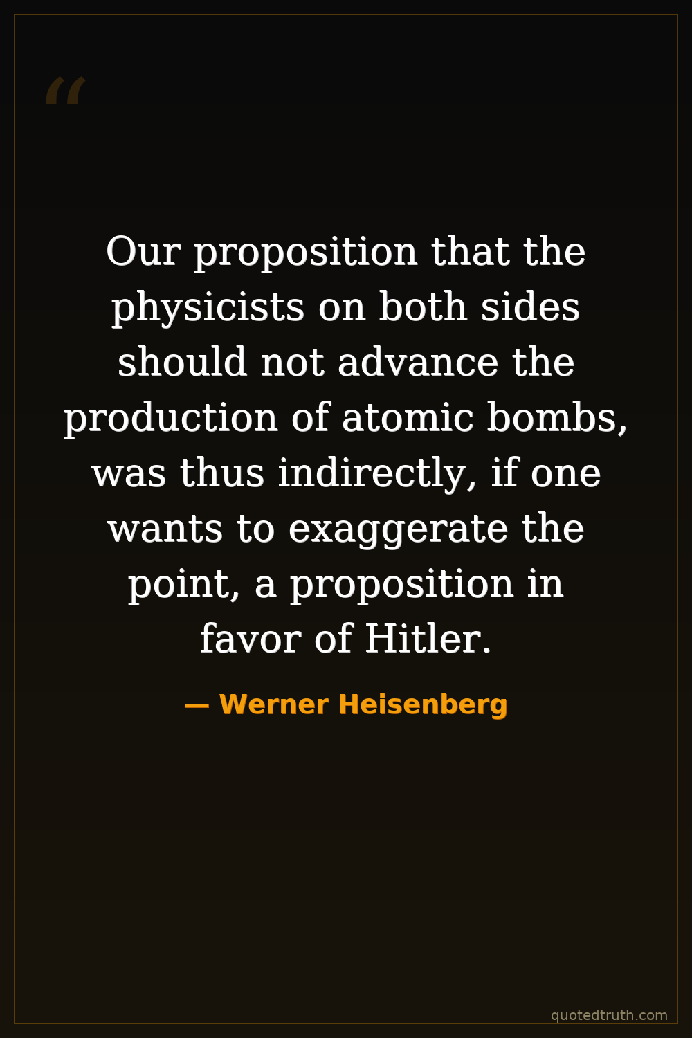 Our proposition that the physicists on both sides should not advance the production of atomic bombs, was thus indirectly, if one wants to exaggerate the point, a proposition in favor of Hitler.