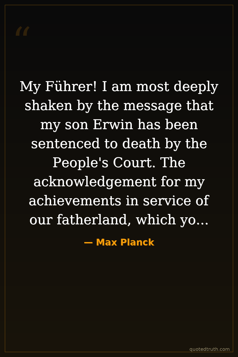 My Führer! I am most deeply shaken by the message that my son Erwin has been sentenced to death by the People's Court. The acknowledgement for my achievements in service of our fatherland, which you, my Führer, have expressed towards me in repeated and most honouring way, makes me confident that you will lend your ear to an imploring 87-year old. As the gratitude of the German people for my life's work, which has become an everlasting intellectual wealth of Germany, I am pleading for my son's life.