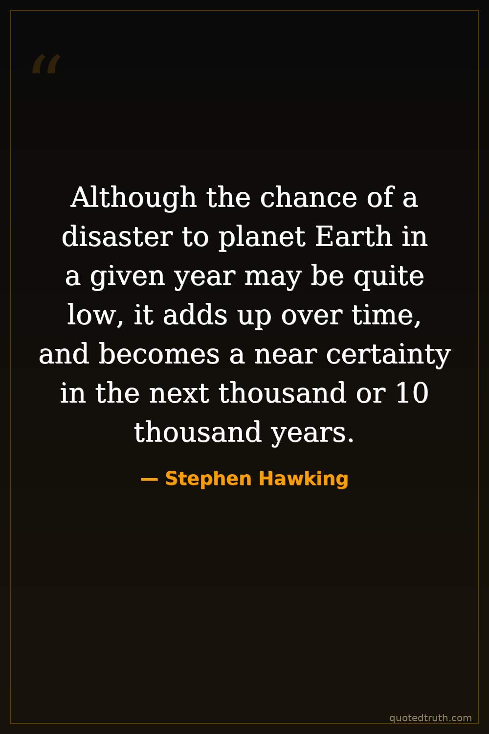 Although the chance of a disaster to planet Earth in a given year may be quite low, it adds up over time, and becomes a near certainty in the next thousand or 10 thousand years.