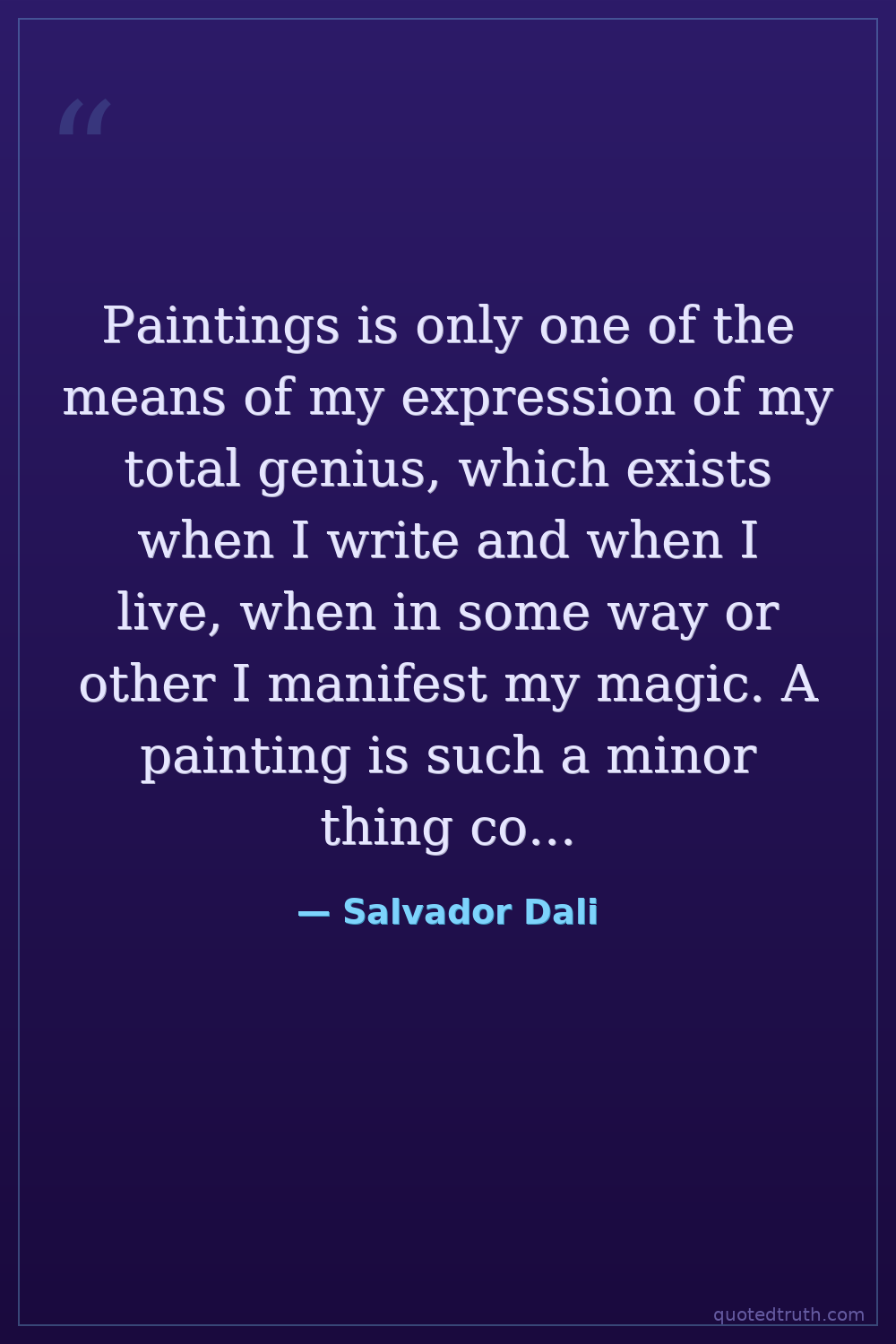 Paintings is only one of the means of my expression of my total genius, which exists when I write and when I live, when in some way or other I manifest my magic. A painting is such a minor thing compared to the magic I radiate.