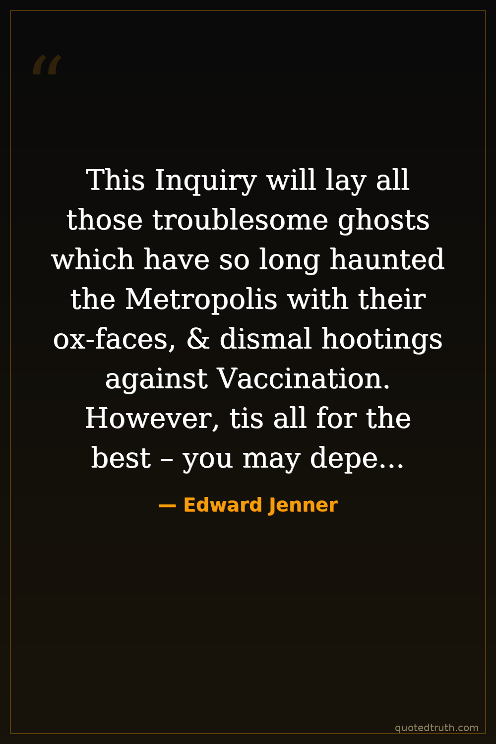 This Inquiry will lay all those troublesome ghosts which have so long haunted the Metropolis with their ox-faces, & dismal hootings against Vaccination. However, tis all for the best – you may depend upon it the new Investigation will prove the touchstone of the vaccine discovery.