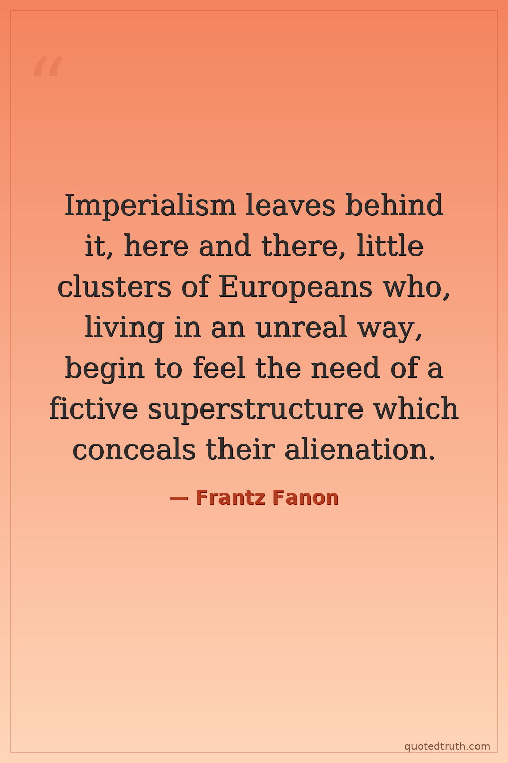 Imperialism leaves behind it, here and there, little clusters of Europeans who, living in an unreal way, begin to feel the need of a fictive superstructure which conceals their alienation.