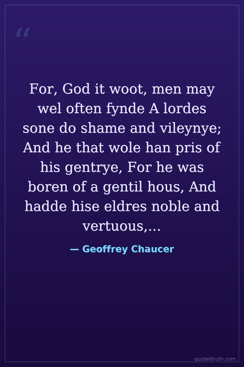 For, God it woot, men may wel often fynde A lordes sone do shame and vileynye; And he that wole han pris of his gentrye, For he was boren of a gentil hous, And hadde hise eldres noble and vertuous, And nel hymselven do no gentil dedis, Ne folwen his gentil auncestre that deed is, He nys nat gentil, be he duc or erl;