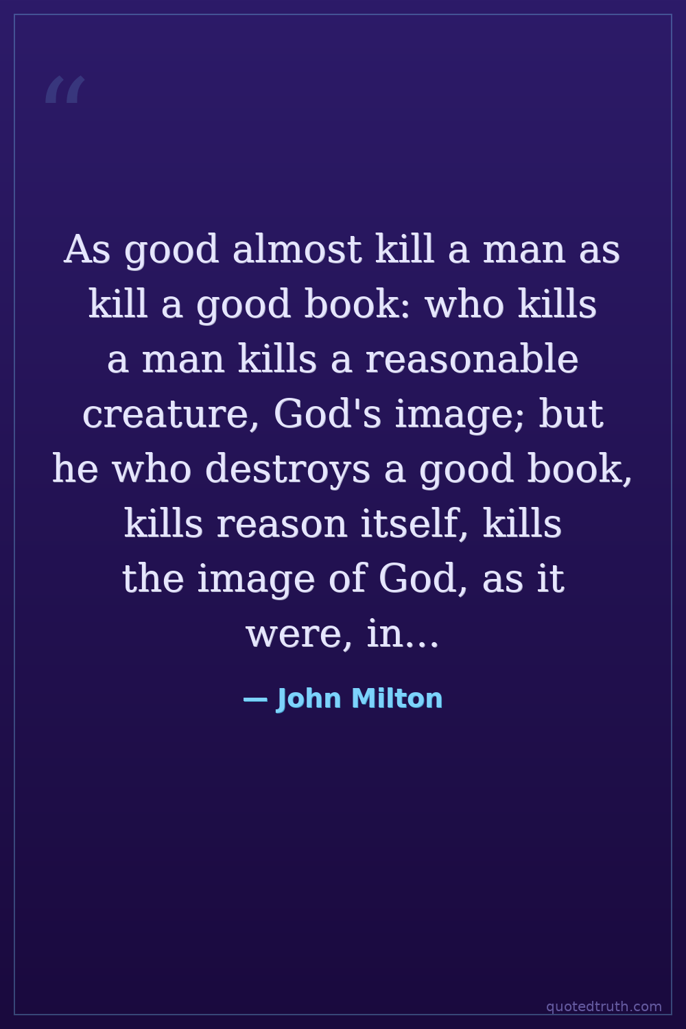 As good almost kill a man as kill a good book: who kills a man kills a reasonable creature, God's image; but he who destroys a good book, kills reason itself, kills the image of God, as it were, in the eye.