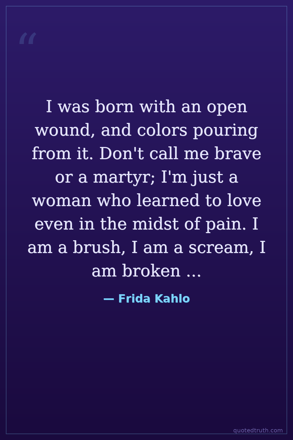 I was born with an open wound, and colors pouring from it. Don't call me brave or a martyr; I'm just a woman who learned to love even in the midst of pain. I am a brush, I am a scream, I am broken flesh and a burning spirit. I paint myself because I am the only thing I know with fury, with tenderness. And if anyone doesn't like it, don't look at me, because I didn't come to fit in, I came to be.