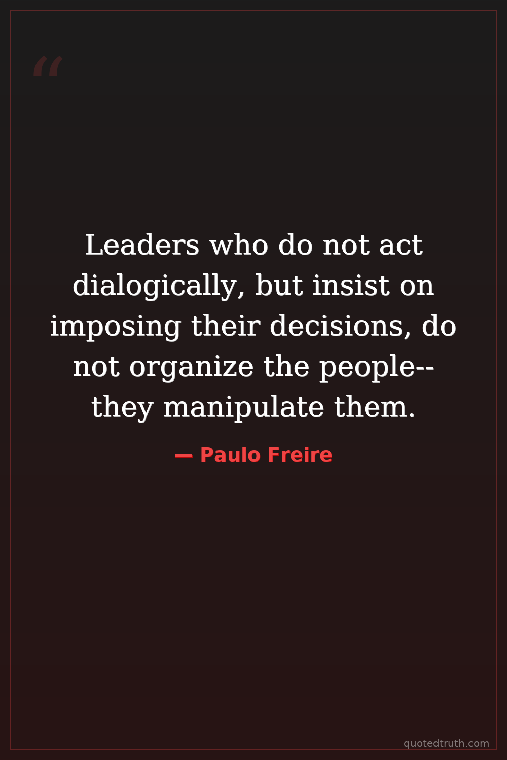 Leaders who do not act dialogically, but insist on imposing their decisions, do not organize the people--they manipulate them.