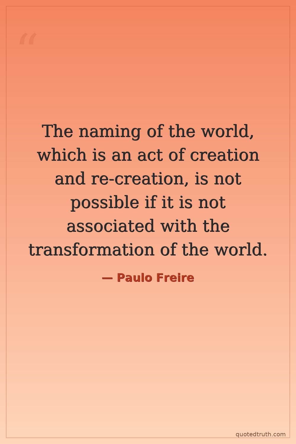 The naming of the world, which is an act of creation and re-creation, is not possible if it is not associated with the transformation of the world.