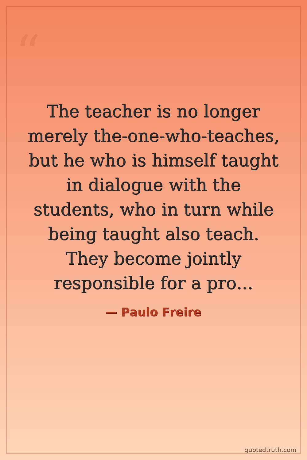 The teacher is no longer merely the-one-who-teaches, but he who is himself taught in dialogue with the students, who in turn while being taught also teach. They become jointly responsible for a process in which all grow.
