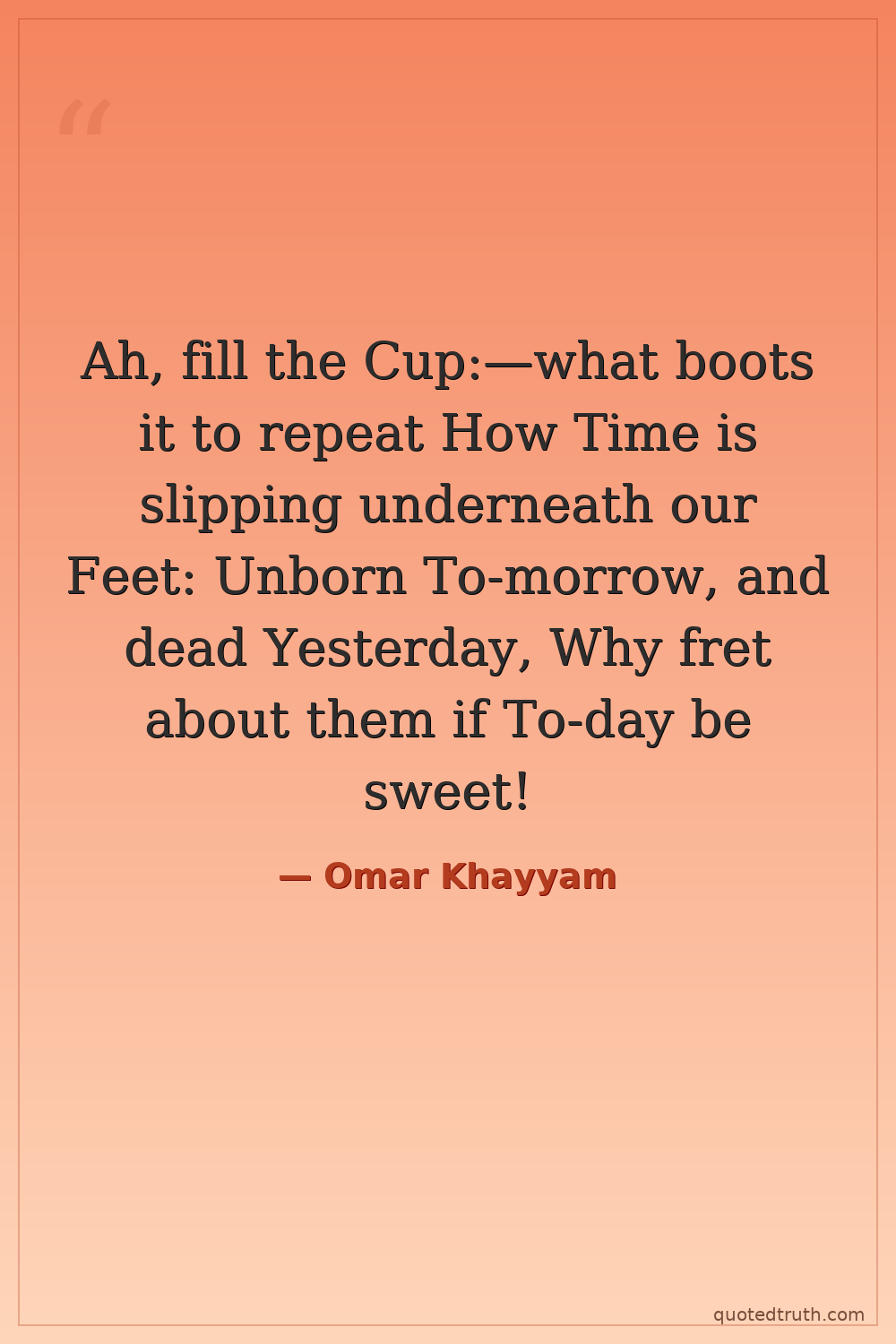 Ah, fill the Cup:—what boots it to repeat How Time is slipping underneath our Feet: Unborn To-morrow, and dead Yesterday, Why fret about them if To-day be sweet!