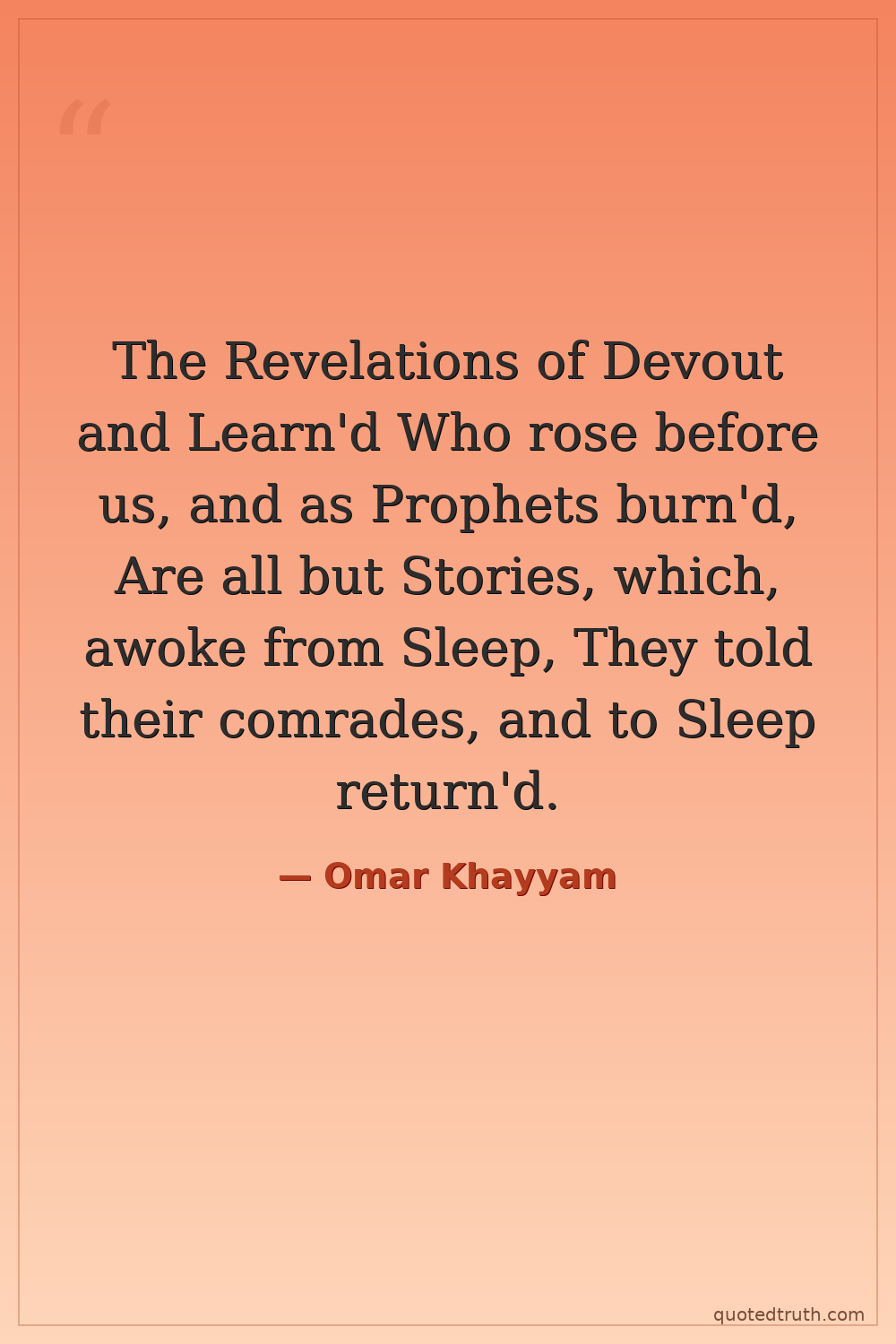 The Revelations of Devout and Learn'd Who rose before us, and as Prophets burn'd, Are all but Stories, which, awoke from Sleep, They told their comrades, and to Sleep return'd.