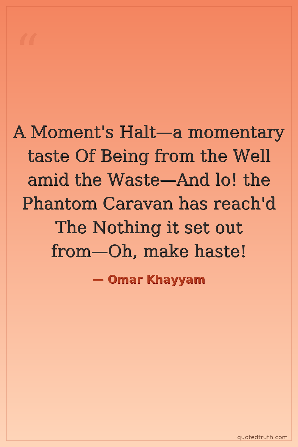 A Moment's Halt—a momentary taste Of Being from the Well amid the Waste—And lo! the Phantom Caravan has reach'd The Nothing it set out from—Oh, make haste!