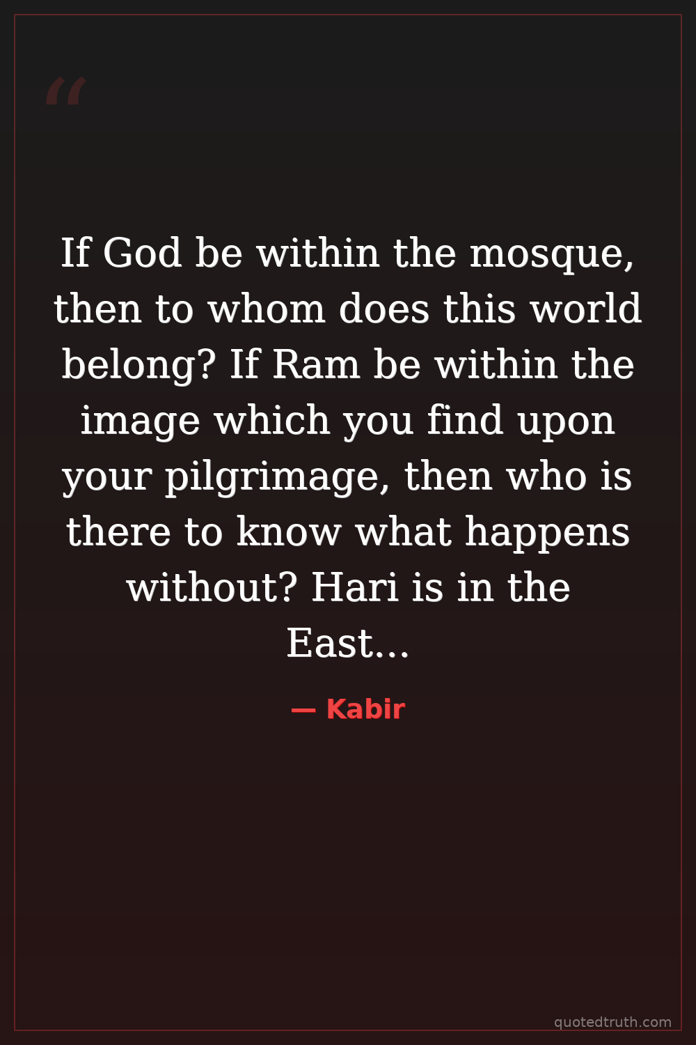 If God be within the mosque, then to whom does this world belong? If Ram be within the image which you find upon your pilgrimage, then who is there to know what happens without? Hari is in the East, Allah is in the West. Look within your heart, for there you will find both Karim and Ram.