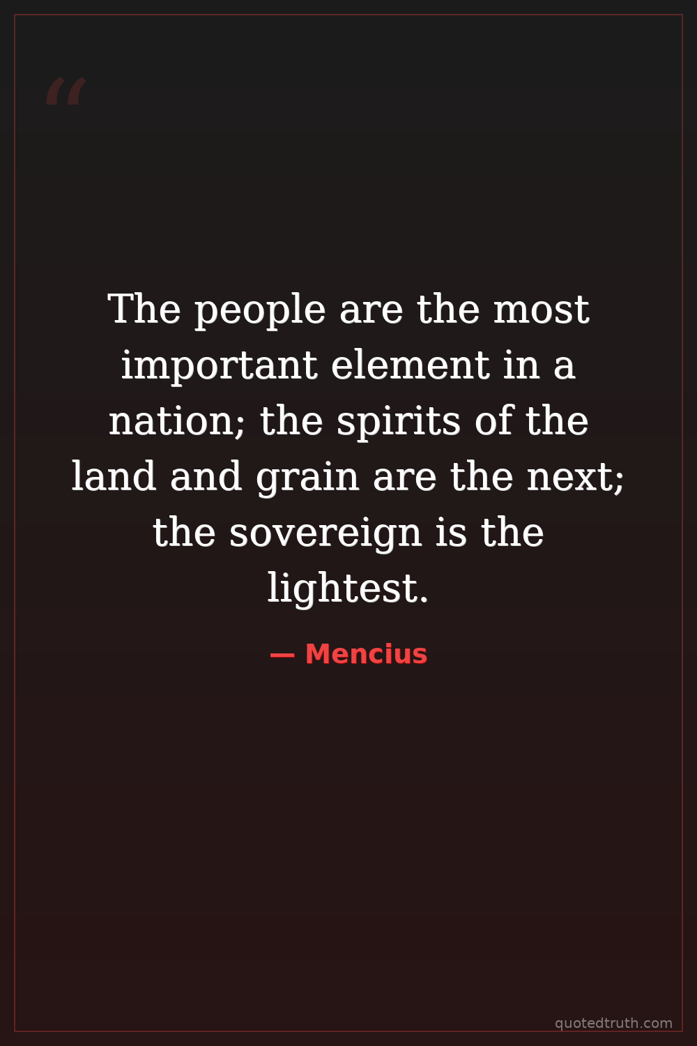 The people are the most important element in a nation; the spirits of the land and grain are the next; the sovereign is the lightest.