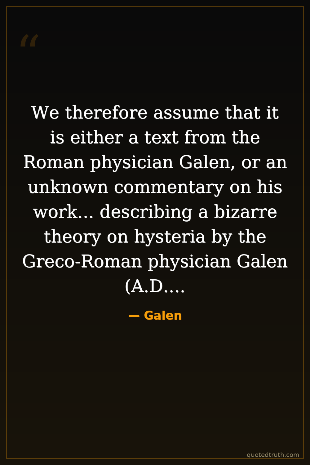 We therefore assume that it is either a text from the Roman physician Galen, or an unknown commentary on his work... describing a bizarre theory on hysteria by the Greco-Roman physician Galen (A.D. 130 –210)... that hysteria was caused by a 'wandering womb.' Instead, he thought women became hysterical, and could suffer from 'hysterical suffocation,' or apnea, when they stopped having intercourse.