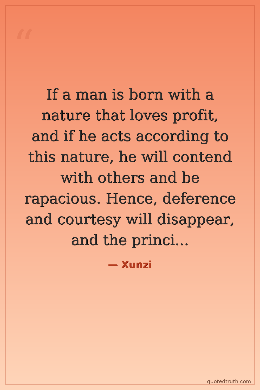 If a man is born with a nature that loves profit, and if he acts according to this nature, he will contend with others and be rapacious. Hence, deference and courtesy will disappear, and the principles of good order and civilization will be lost.