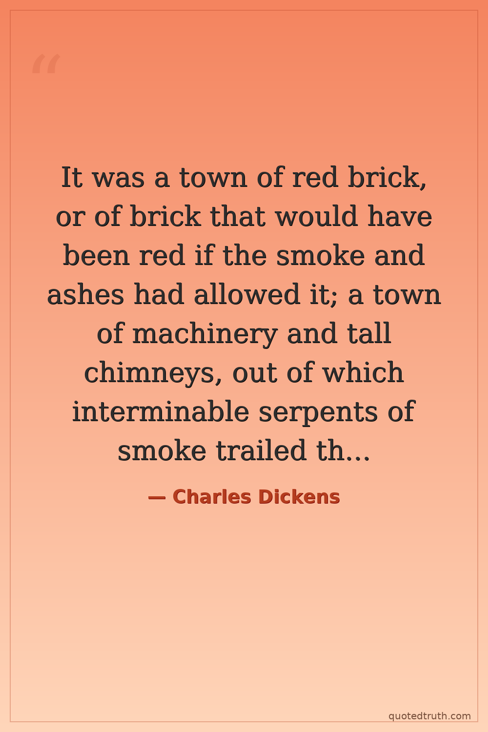 It was a town of red brick, or of brick that would have been red if the smoke and ashes had allowed it; a town of machinery and tall chimneys, out of which interminable serpents of smoke trailed themselves for ever and ever, and never got uncoiled.