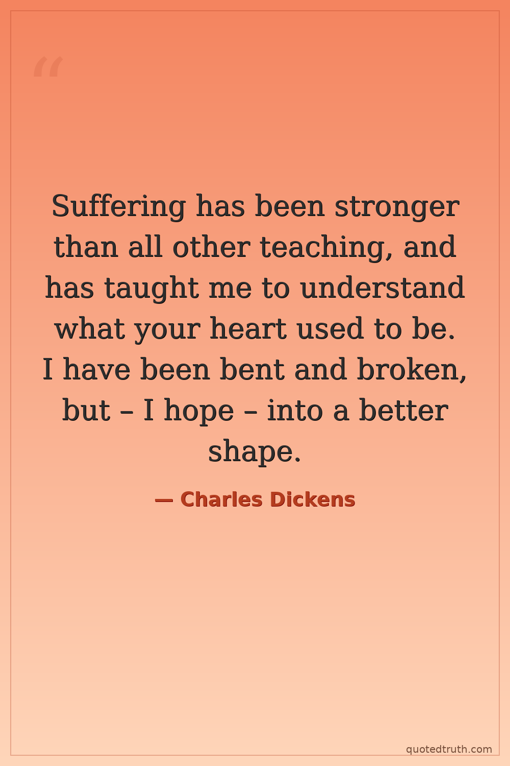 Suffering has been stronger than all other teaching, and has taught me to understand what your heart used to be. I have been bent and broken, but – I hope – into a better shape.