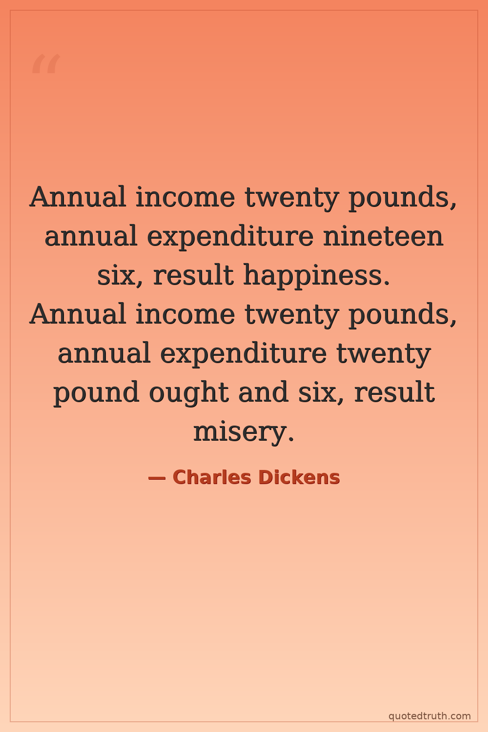 Annual income twenty pounds, annual expenditure nineteen six, result happiness. Annual income twenty pounds, annual expenditure twenty pound ought and six, result misery.