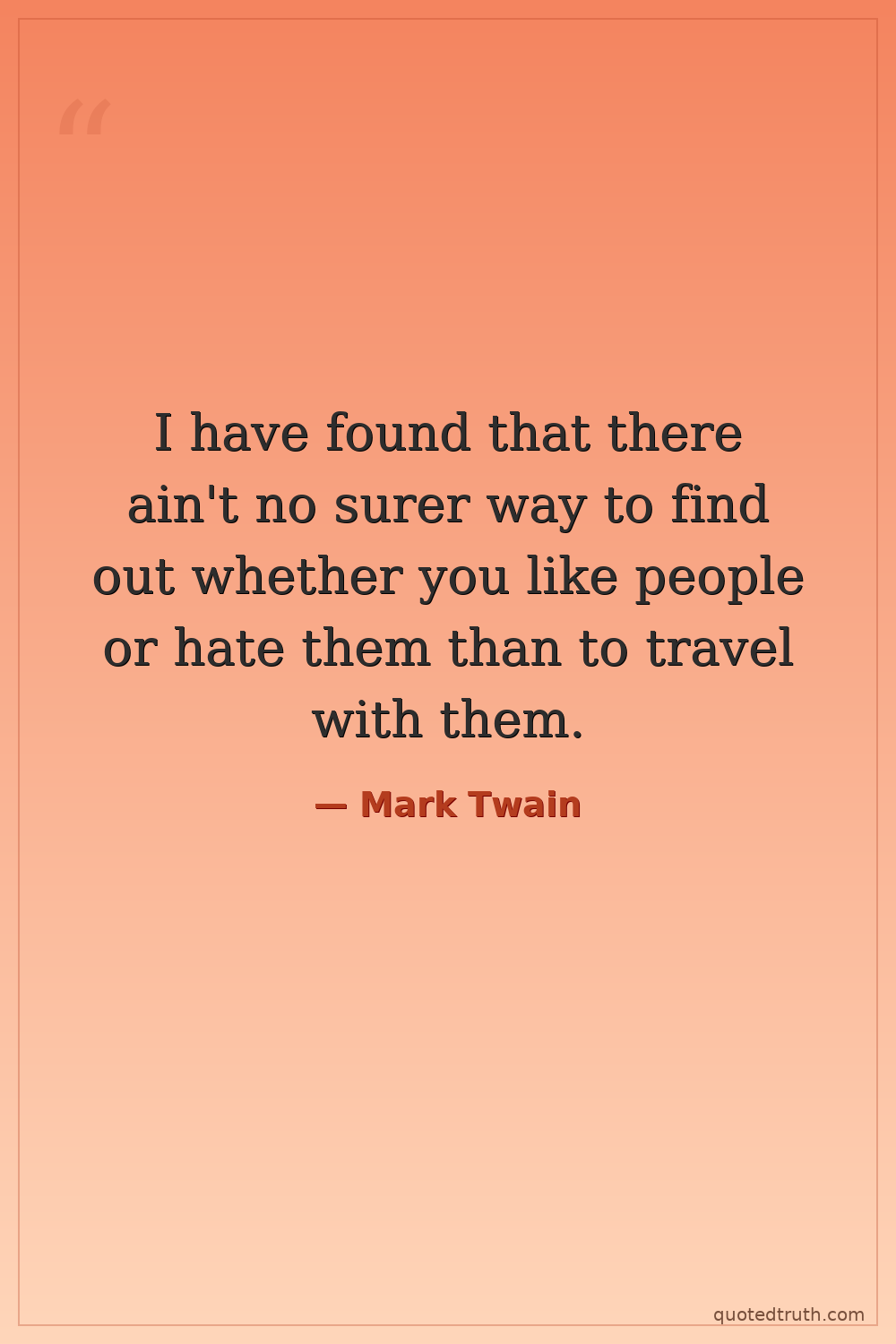 I have found that there ain't no surer way to find out whether you like people or hate them than to travel with them.