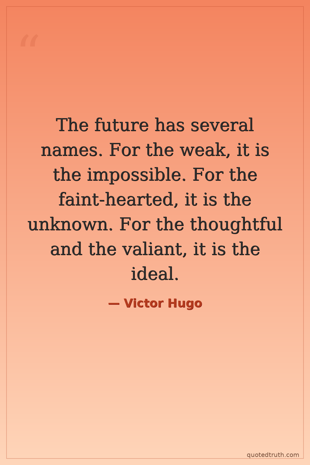 The future has several names. For the weak, it is the impossible. For the faint-hearted, it is the unknown. For the thoughtful and the valiant, it is the ideal.