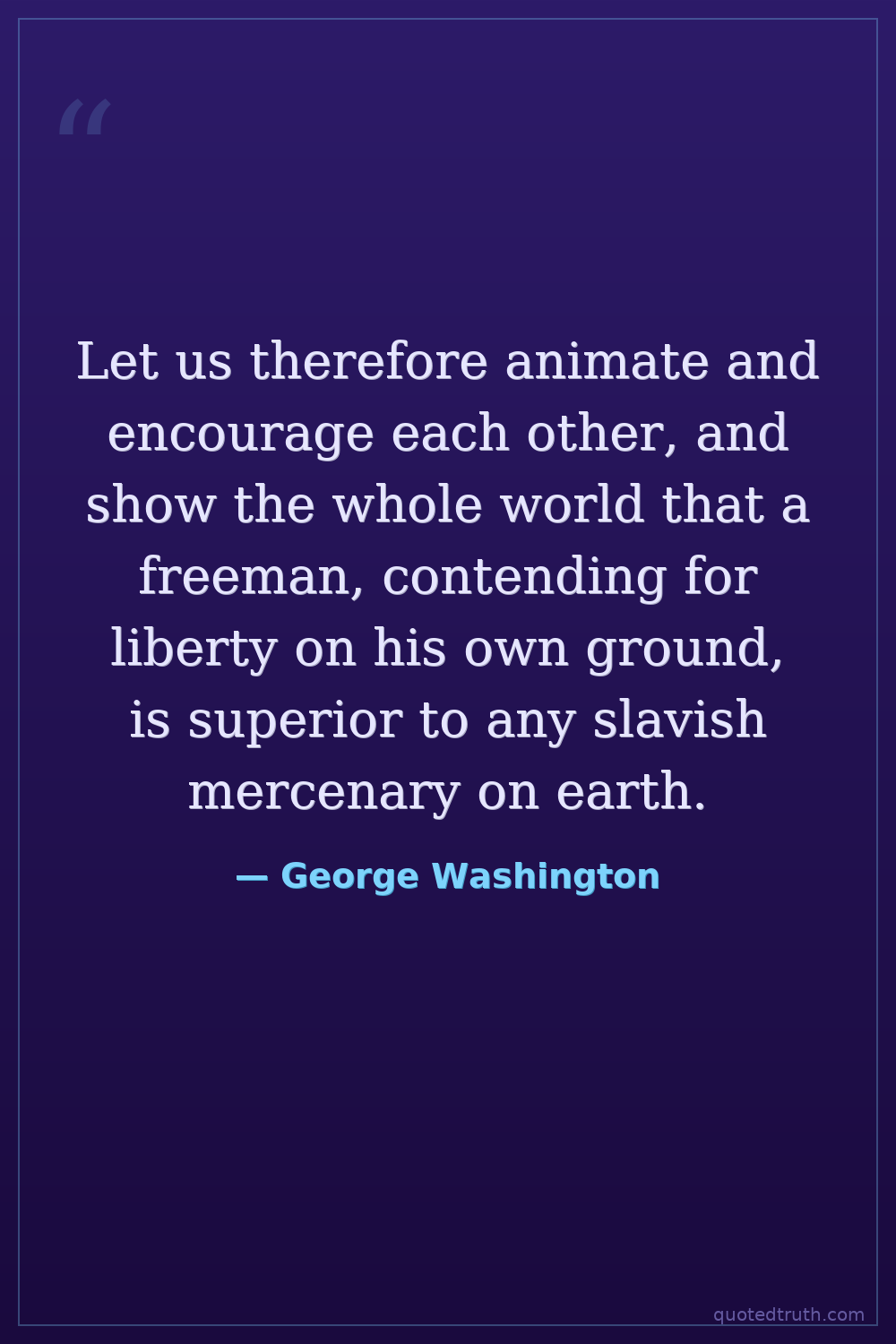 Let us therefore animate and encourage each other, and show the whole world that a freeman, contending for liberty on his own ground, is superior to any slavish mercenary on earth.