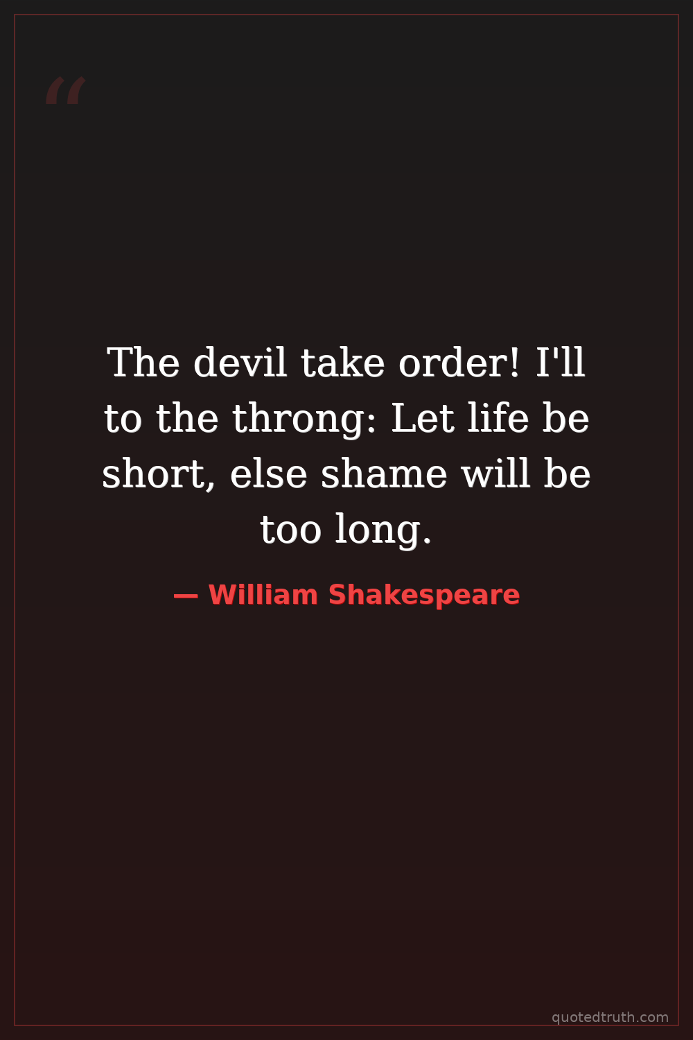 The devil take order! I'll to the throng: Let life be short, else shame will be too long.