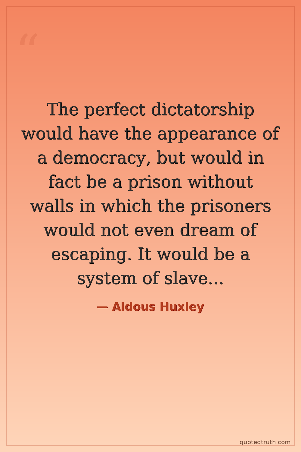 The perfect dictatorship would have the appearance of a democracy, but would in fact be a prison without walls in which the prisoners would not even dream of escaping. It would be a system of slavery where, thanks to consumption and entertainment, the slaves would love their servitude.