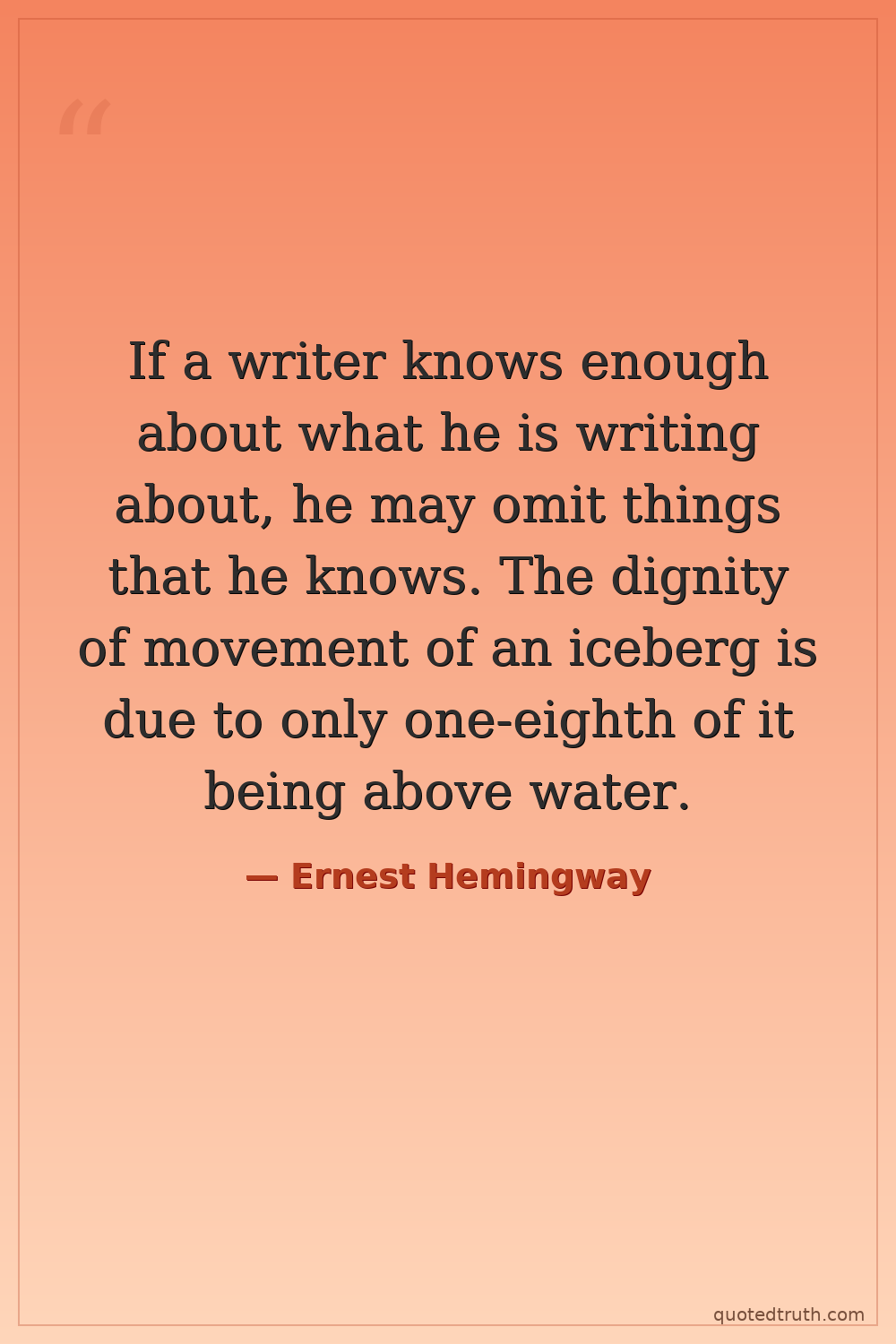 If a writer knows enough about what he is writing about, he may omit things that he knows. The dignity of movement of an iceberg is due to only one-eighth of it being above water.