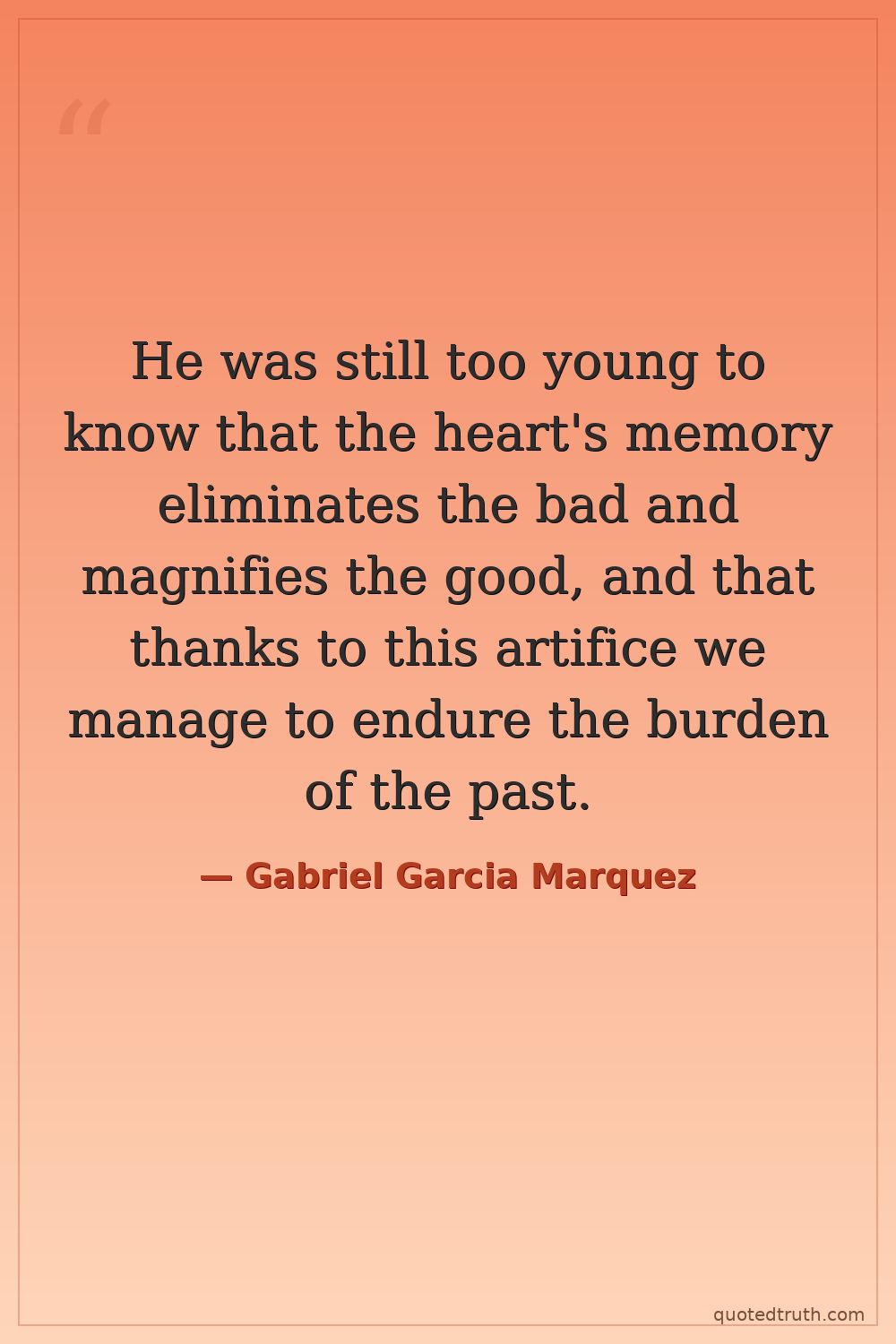 He was still too young to know that the heart's memory eliminates the bad and magnifies the good, and that thanks to this artifice we manage to endure the burden of the past.