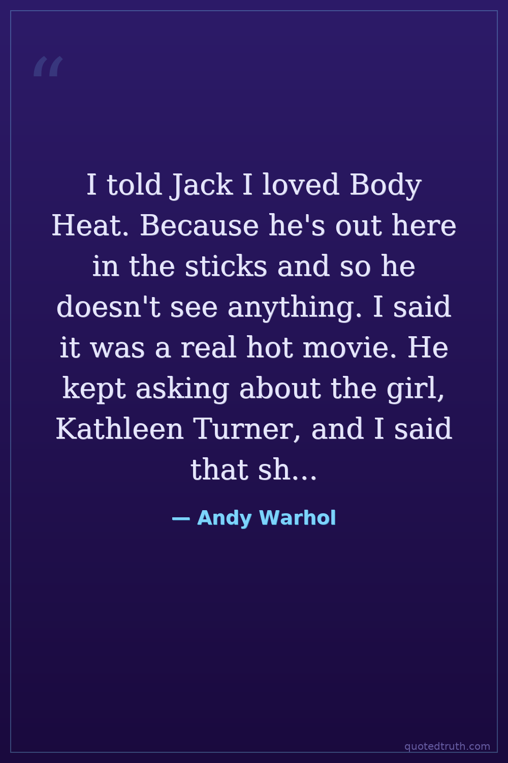 I told Jack I loved Body Heat. Because he's out here in the sticks and so he doesn't see anything. I said it was a real hot movie. He kept asking about the girl, Kathleen Turner, and I said that she'd never be remembered.