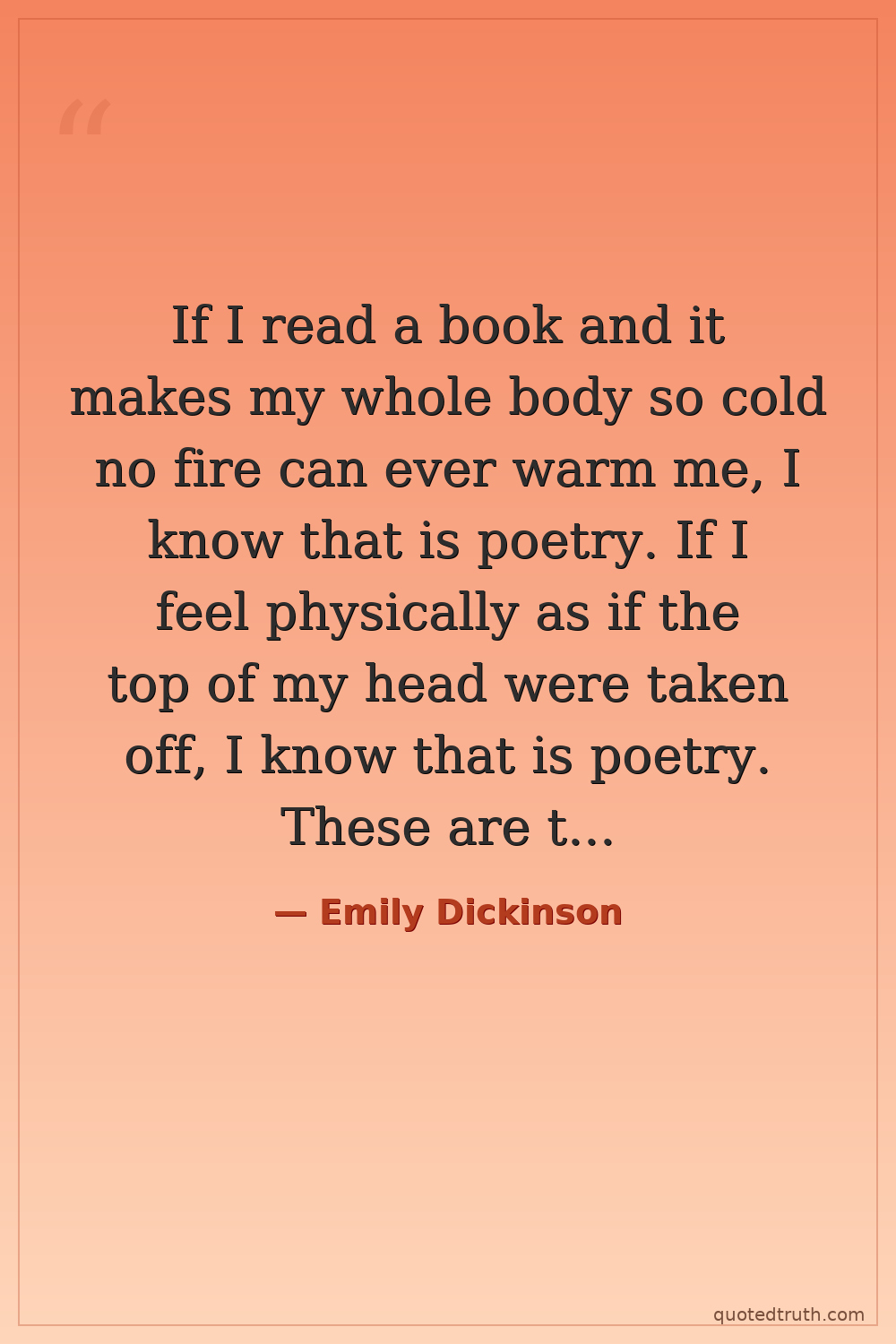 If I read a book and it makes my whole body so cold no fire can ever warm me, I know that is poetry. If I feel physically as if the top of my head were taken off, I know that is poetry. These are the only ways I know it. Is there any other way? — Emily Dickinson Modern Poetry