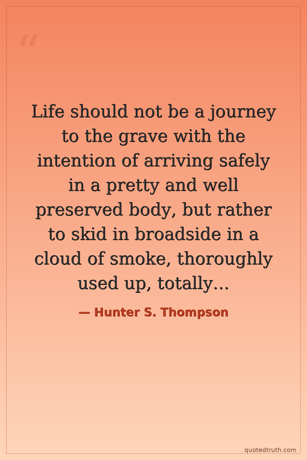 Life should not be a journey to the grave with the intention of arriving safely in a pretty and well preserved body, but rather to skid in broadside in a cloud of smoke, thoroughly used up, totally worn out, and loudly proclaiming 'Wow! What a Ride!'