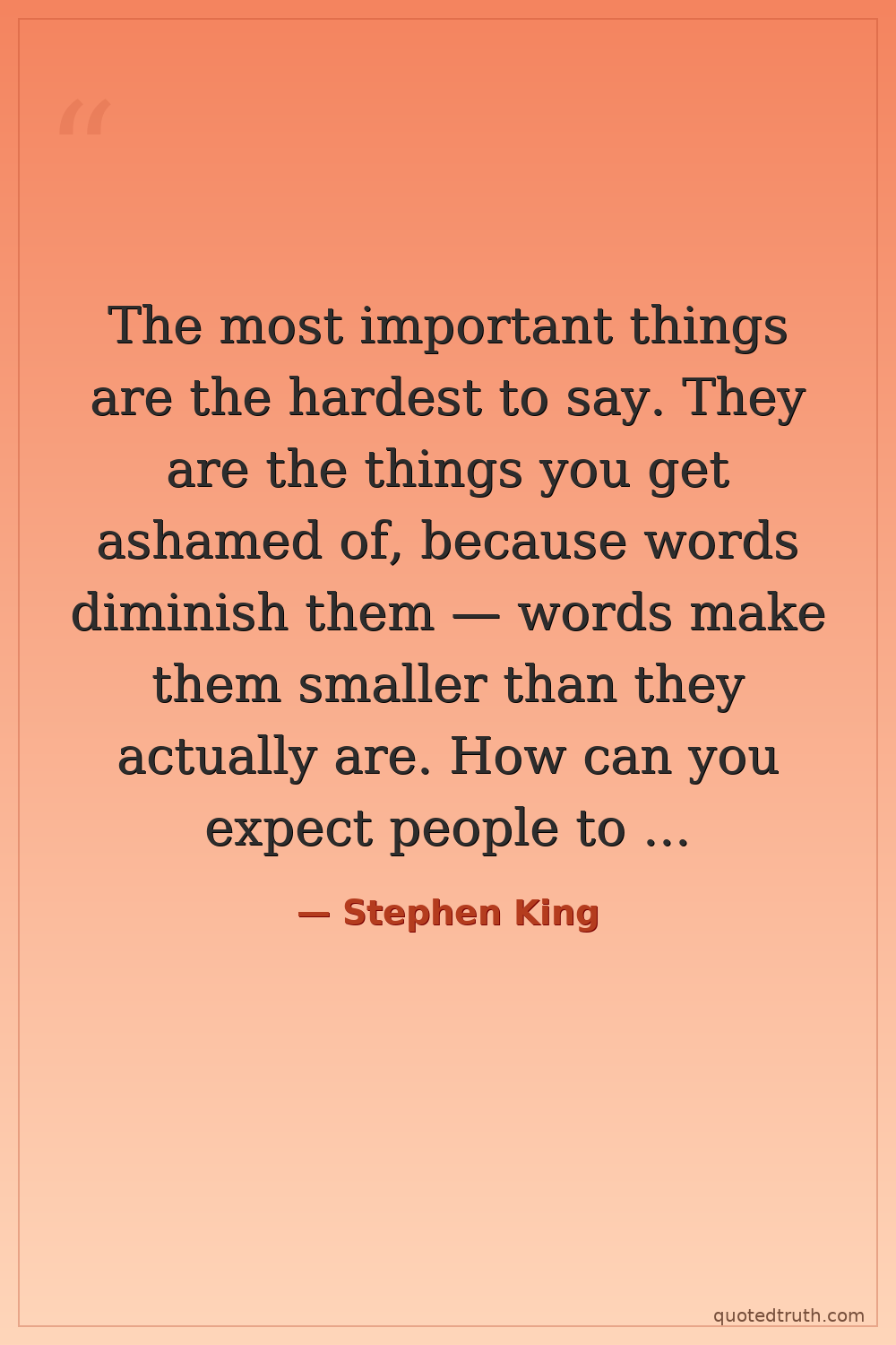 The most important things are the hardest to say. They are the things you get ashamed of, because words diminish them — words make them smaller than they actually are. How can you expect people to believe you when you stand there blubbering, for Christ's sake, with tears running down your face, telling them how much you love so-and-so? You can't. The important things lie too close to your true self, whatever that is, for them to be gotten at easily. You finally arrive at the truth, but it's like pulling teeth. And when you get the all-important truth out, something happens. The truth is, you've got to be a little crazy to write, and you've got to be a little crazy to read, and you've got to be a little crazy to live.
