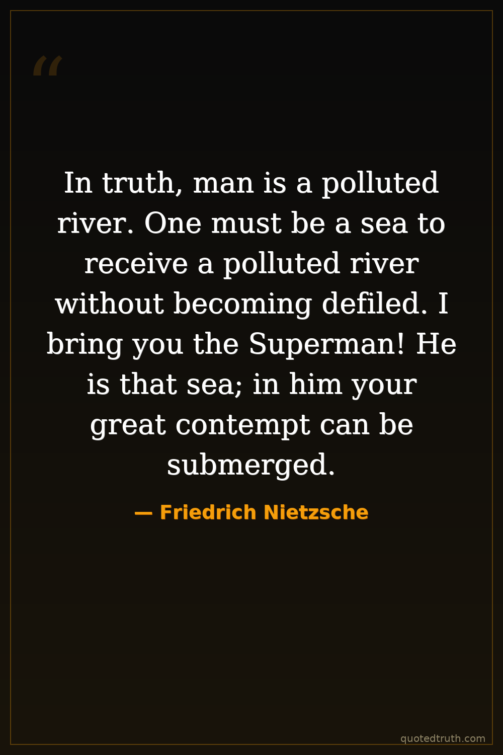 In truth, man is a polluted river. One must be a sea to receive a polluted river without becoming defiled. I bring you the Superman! He is that sea; in him your great contempt can be submerged.