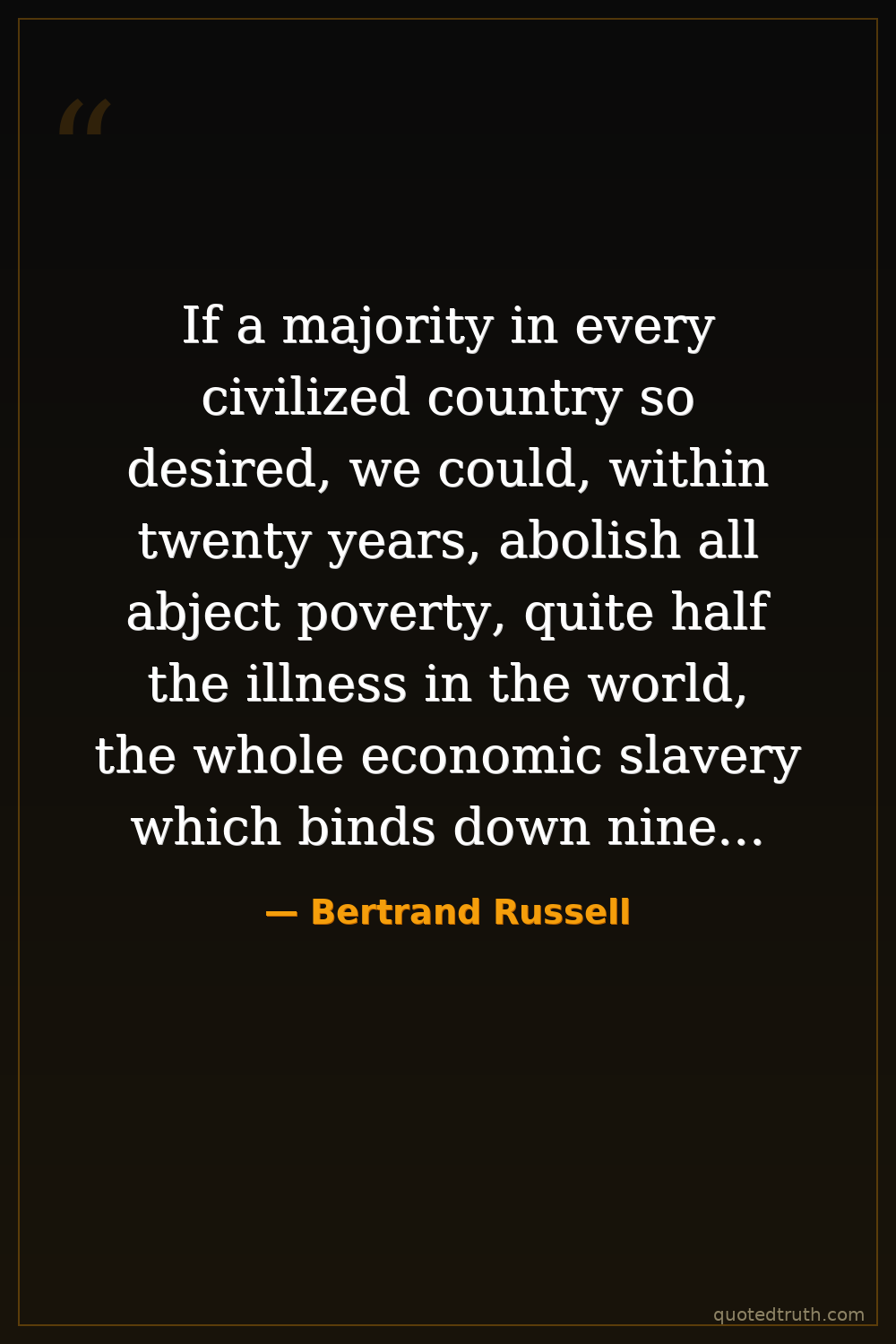 If a majority in every civilized country so desired, we could, within twenty years, abolish all abject poverty, quite half the illness in the world, the whole economic slavery which binds down nine tenths of our population; we could fill the world with beauty and joy, and secure the reign of universal peace. It is only because men are apathetic that this is not achieved...