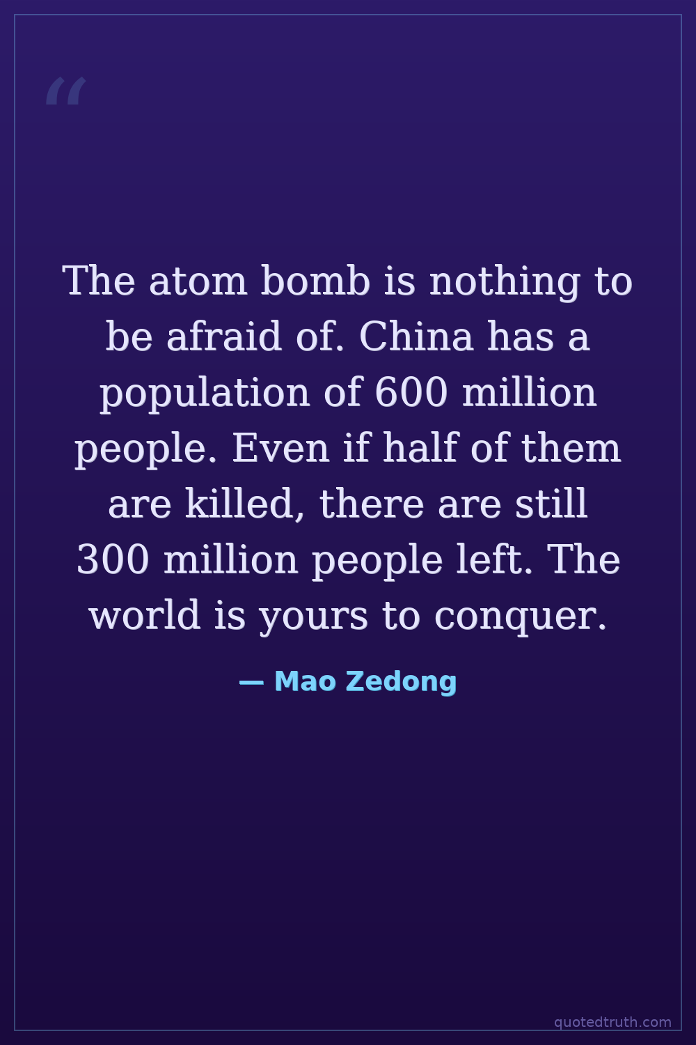 The atom bomb is nothing to be afraid of. China has a population of 600 million people. Even if half of them are killed, there are still 300 million people left. The world is yours to conquer.
