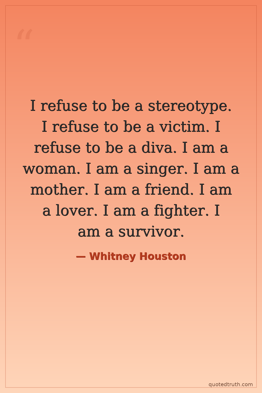 I refuse to be a stereotype. I refuse to be a victim. I refuse to be a diva. I am a woman. I am a singer. I am a mother. I am a friend. I am a lover. I am a fighter. I am a survivor.