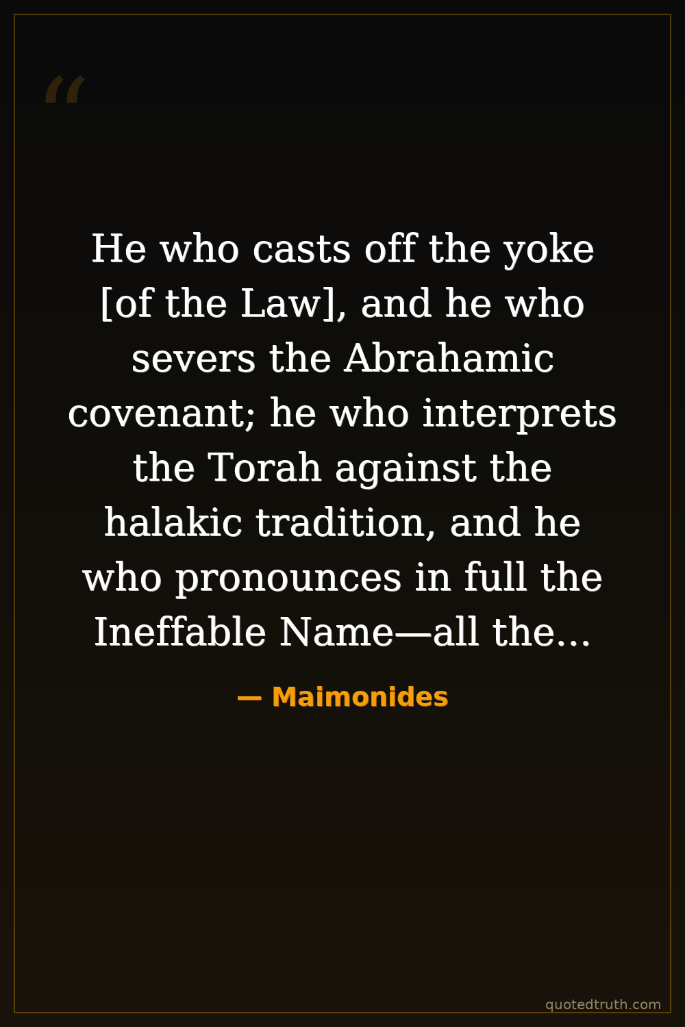 He who casts off the yoke [of the Law], and he who severs the Abrahamic covenant; he who interprets the Torah against the halakic tradition, and he who pronounces in full the Ineffable Name—all these have no share in the world to come. — Maimonides Medieval Jewish philosopher