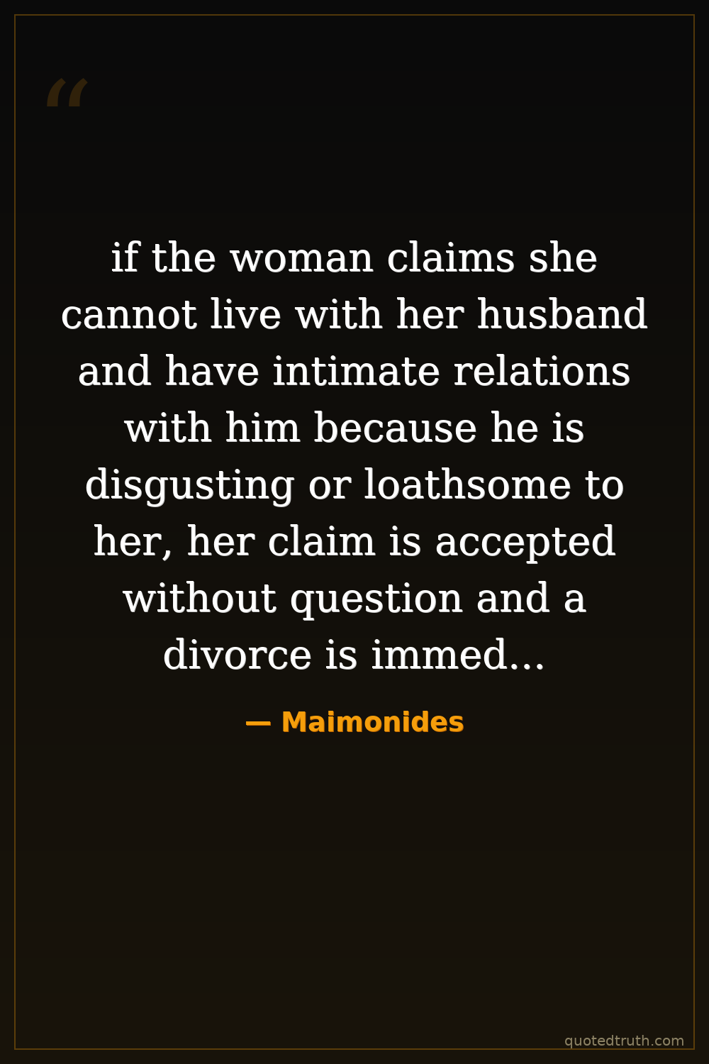 if the woman claims she cannot live with her husband and have intimate relations with him because he is disgusting or loathsome to her, her claim is accepted without question and a divorce is immediately granted, although she loses the money of her ketubbah.
