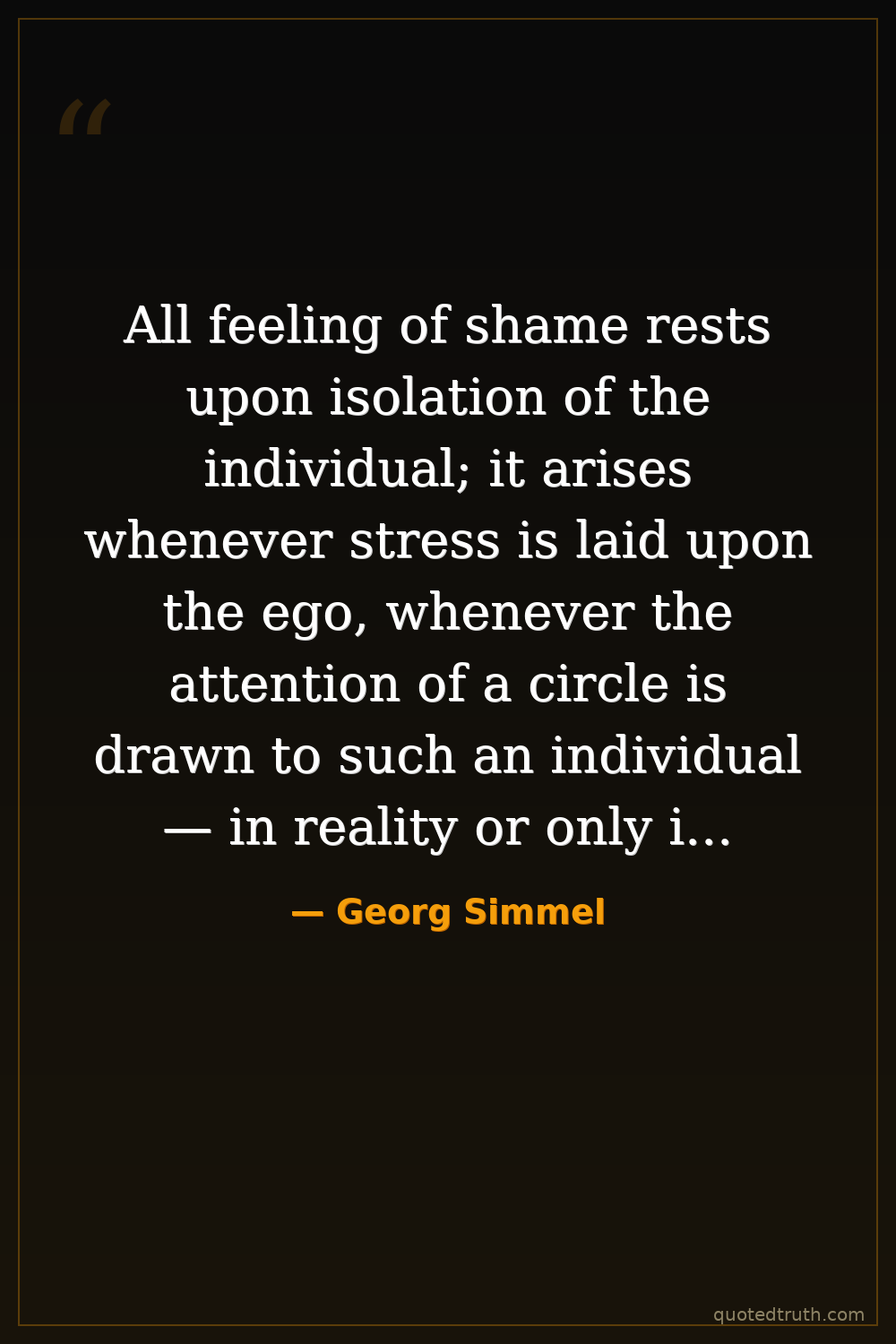 All feeling of shame rests upon isolation of the individual; it arises whenever stress is laid upon the ego, whenever the attention of a circle is drawn to such an individual — in reality or only in his imagination — which at the same time is felt to be in some way incongruous.