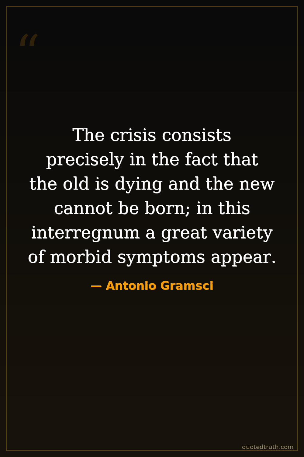 The crisis consists precisely in the fact that the old is dying and the new cannot be born; in this interregnum a great variety of morbid symptoms appear.