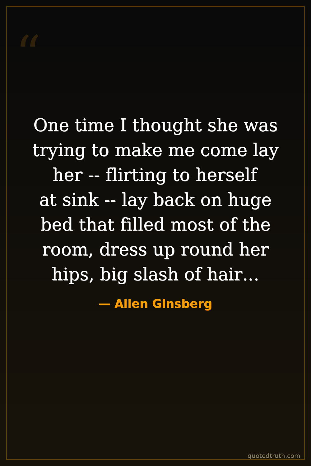 One time I thought she was trying to make me come lay her -- flirting to herself at sink -- lay back on huge bed that filled most of the room, dress up round her hips, big slash of hair...